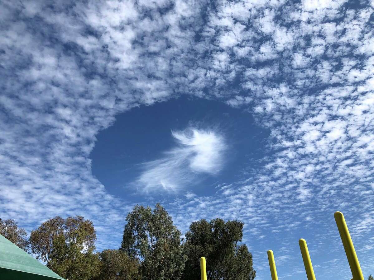 Hole-Punch Cloud  Scientists have known for some time that the effect occurs when the ice crystals grow large enough to fall below as a fallstreak. a fallstreak hole (also known as a hole punch cloud) is a large circular or elliptical gap that can appear in cirrocumulus or altocumulus clouds.  cluster of cavum over the gulf of mexico off of. Hole-Punch Cloud.